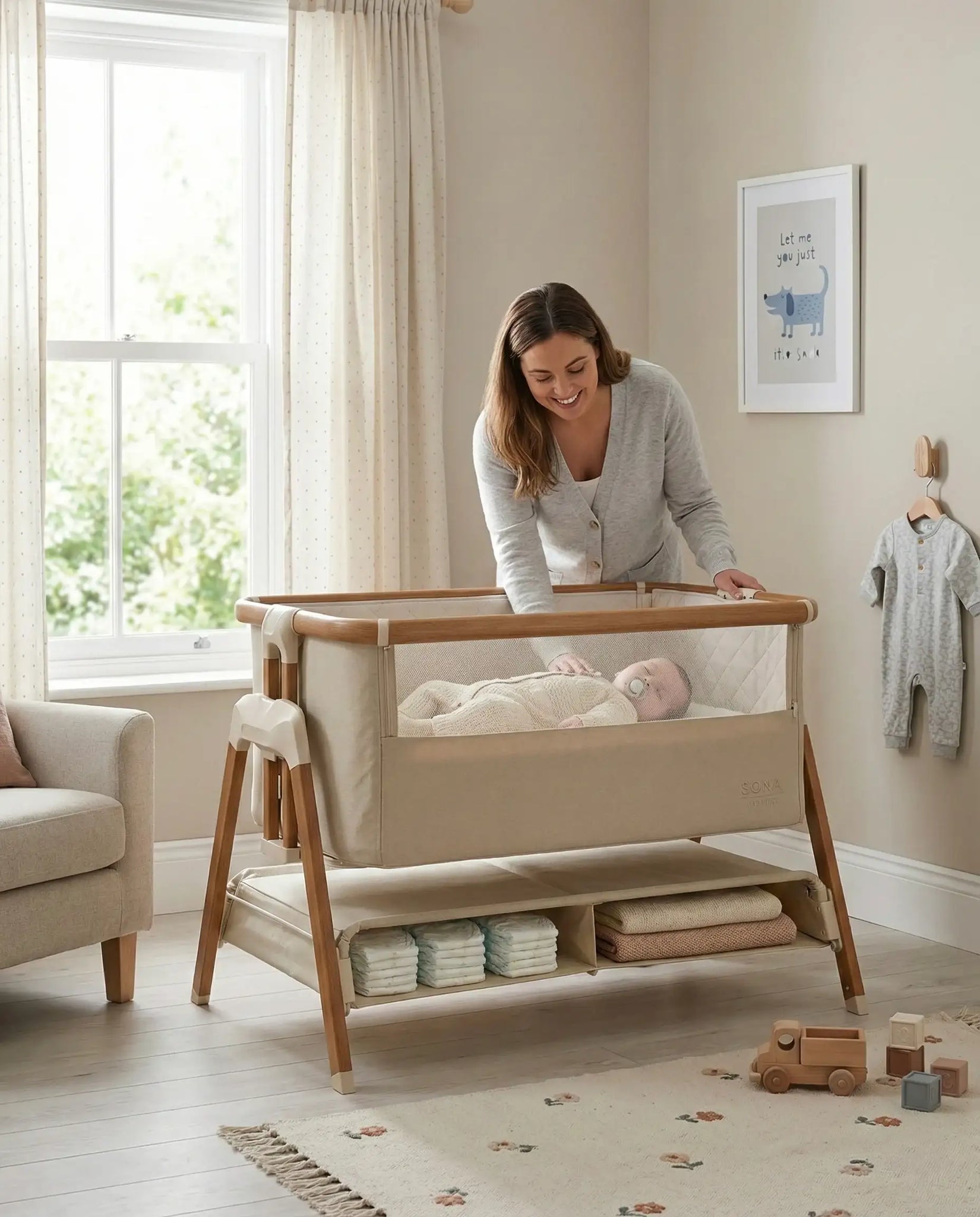 - Safe & Comforting Bedside Crib – Keep your newborn close through the night with the Sona baby bedside crib, designed for safe co-sleeping while giving your baby their own secure sleep space.